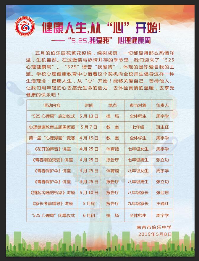 同学们,从现在开始,给自己的心灵注入微笑、乐观、自信,悦纳自我,笑对人生!最后,我们衷心地祝愿伯乐中学第二届“525 心理健康周”活动圆满成功。