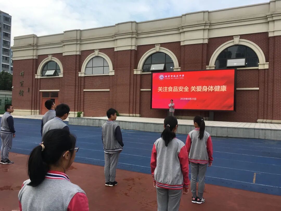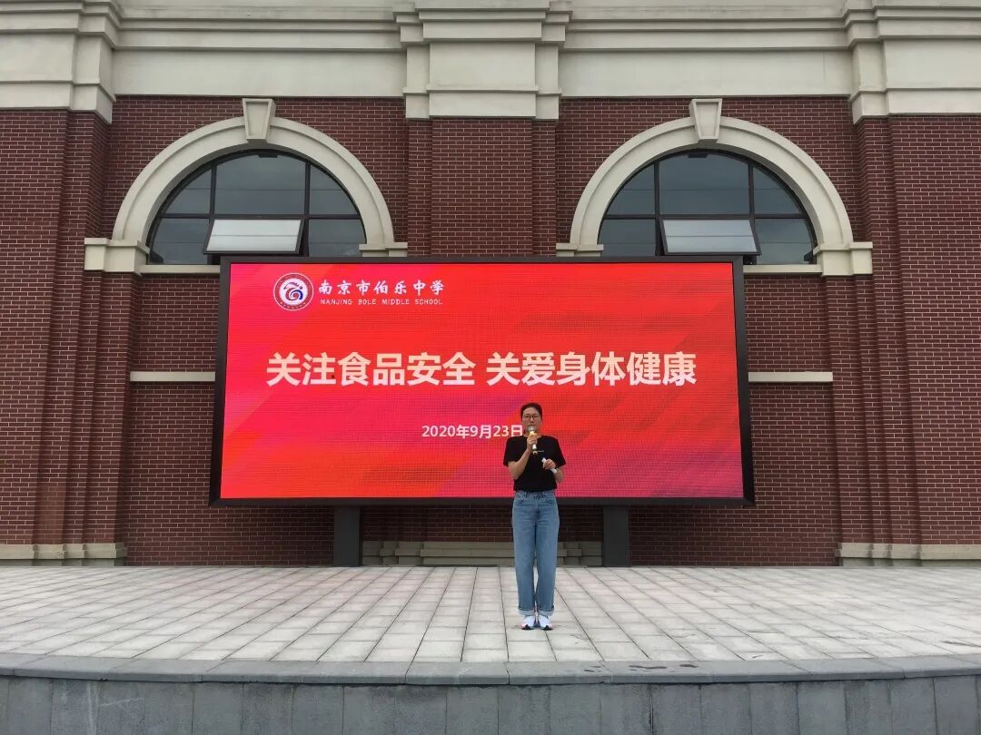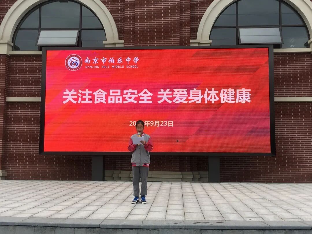 金秋九月,丹桂飘香,为了进一步强化食品安 全主体责任,不断提高全校师生对食品安全重要性的认识,2020年9月23日上午,南京市伯乐中学开展“关注食品安全,关爱身体健康”主题晨会。本次晨会由总务处陈阳副主任主持,首先,八(4)班的杨欣萌同学进行主题为《关注食品安全 珍爱身体健康》的演讲。她从食品安全的定义、食品的质量安全、食品安全的意义等方面进行了生动的演讲。